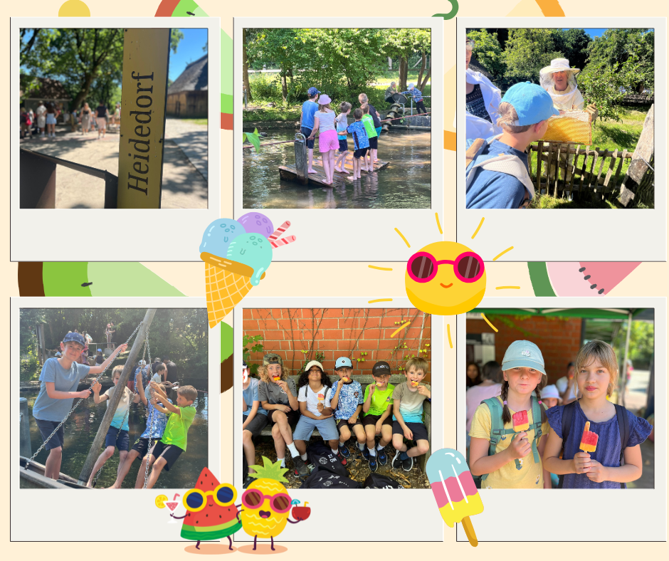 Kurz vor den Ferien ging es nämlich für die ganze Schule zum Freilichtmuseum Kiekeberg. Dort hatten alle Klassen verschiedene Programme gebucht. Es wurden alte Kinderspiele gespielt, das Leben im Bauernhaus erkundet und viel über die Honigbienen gelernt. Anschließend ging es für alle gemeinsam zur Abkühlung zum Wasserspielplatz!