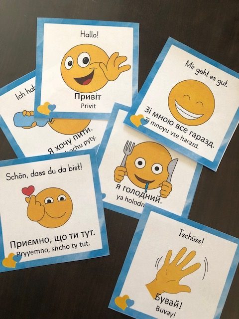 Die ersten Kinder aus der Ukraine sind bereits in der Schule am Sandberg angekommen und wurden von allen herzlich aufgenommen. Damit wir miteinander besser kommunizieren können, behelfen wir uns mit Wortkarten, die sowohl auf ukrainisch als auch auf deutsch eine erste Verständigung möglich machen.