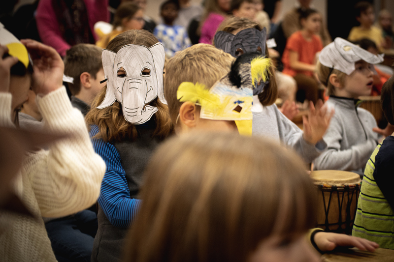 Löwen, Affen, Zebras, Elefanten, Krokodile und Vögel machten sich auf den Weg, um die kleine Trommel Djembe nach Hause zu bringen. Die Sterne leuchteten ihnen dabei den Weg.